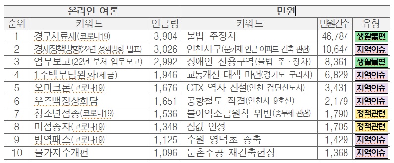* 민원 : 국민신문고, 지자체 별도 창구로 접수되어 민원분석시스템에 수집된 데이터 분석결과로 중·반복민원 포함(12.20~12.26.) / 온라인 여론 : 문체부 정책여론수렴시스템 뉴스·트위터·커뮤니티 분석결과(12.16.∼12.22.)