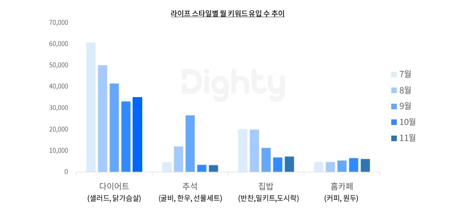 ⠂집밥 관련 키워드도 8월 이후 하락했으며, 홈카페 키워드는 9월 이후 상승하는 추이가