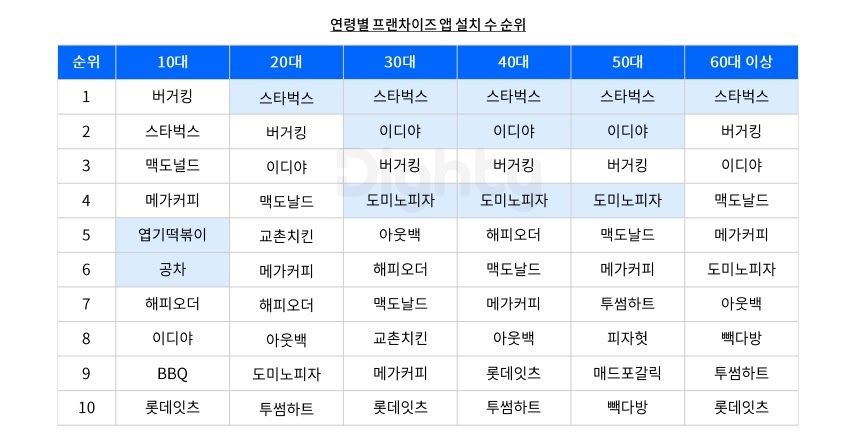 ⠂30대~50대는 1,2위에 커피 브랜드가 자리했으며, 도미노피자의 순위도 다른 연령대