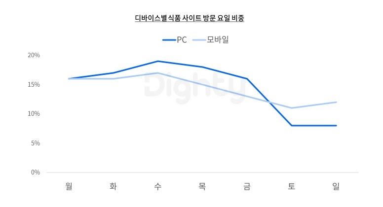 ⠂모바일 방문비중도 수요일이 가장 많았지만, 목요일부터 감소세가 이어지다 일요일에