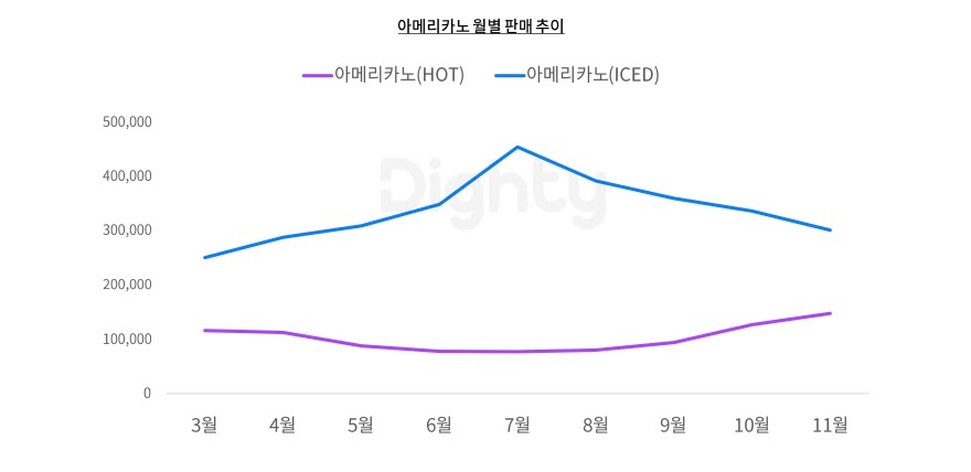 ⠂뜨거운 아메리카노는 가장 최근인 11월이 가장 판매 수가 많았으며, 여름(7월)보다
